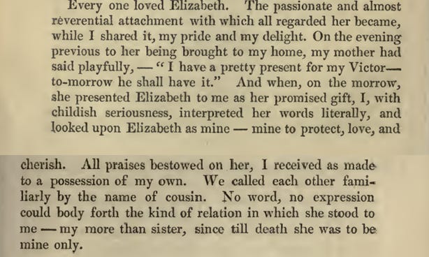 O romance de Mary Shelley é uma feroz contestação das lógicas patriarcais. Estão ali figurados os grandes problemas da Sociedade Patriarcal Moderna®, desde a arrogância iluminista diante até o desejo de controlar a geração da vida. E, se Alphonse (o pai de Victor no livro) é muito diferente do tirânico Tywin Lannister Leopold interpretado por Charles Dance, ele ainda era um patriarca burguês incapaz de compreender plenamente os sentimentos do filho. O comentário de classe — por sinal deixado de lado no filme — não é à toa: a ideia de controle que se entranha no caráter de Victor é herdeira de uma família há gerações no poder. Não nos esqueçamos que a Elizabeth do livro é ofertada como um presente ao pequeno Victor, o que gera a memorável passagem no final do primeiro capítulo da versão de 18311 (p. 22-23, em tradução livre):