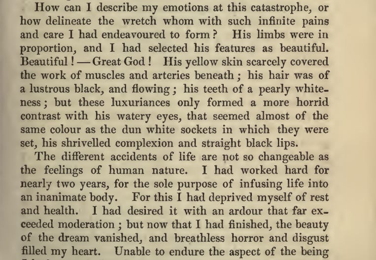 Os diversos acidentes da vida não são tão mutáveis quanto os sentimentos da natureza humana. Trabalhei arduamente por quase dois anos com o único propósito de infundir vida em um corpo inanimado. Para isso, privei-me de descanso e saúde. Desejei-o com um ardor que ultrapassava em muito a moderação; mas, agora que havia terminado, a beleza do sonho se dissipou e um horror e repulsa sufocantes tomaram conta do meu coração (p. 43, em tradução livre).